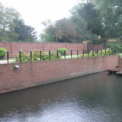 WALMUUR VAN HET PAD ONDERLANGS HET VOORPLEIN. Het aardwerk, waarop het pad onderlangs het voorplein is gelegd, wordt aan de zijde van de binnengracht gesteund door een bakstenen walmuur, bekroond door ijzeren balusterleuningen welke aansluiten op de onderbrug, die vanaf het pad naar het souterrain van het hoofdgebouw voert (4e kwart 17e eeuw).