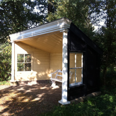 PRIEEL. In het bos op het noordelijk parkdeel een 19e-eeuws houten prieel, dat tevens in gebruik was als muziektent en waarvan de door halve zuilen gemarkeerde, ieder van een venster voorziene zijwanden schuin naar binnen en het vlakke dak achterwaarts schuin naar beneden lopen.
