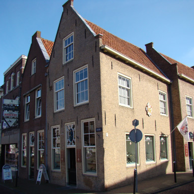 Pand op de hoek van de Tol, 17e eeuw. Zadeldak en puntgevel met vlechtingen. Vensters met acht- en negenruitsschuiframen.