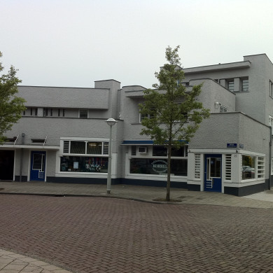 ZUIDWESTELIJKE REEKS WINKELS EN BOVENWONINGEN. Uit 1924-26 daterende reeks van twee bouwlagen in het midden en met drie bouwlagen op de onder stompe hoek aansluitende zijvleugels, en met beneden winkels en boven woningen; de toegangen tot de winkels in het midden zijn gekoppeld onder een luifel, en de toegangen tot de hoekwinkels zijn, evenals de eerste verdieping, naar voren uitgebouwd en voorzien van horizontaal verdeelde smalle vensterstroken te weerszijden, om de hoek herhaald bij de etalageruiten, waarboven een doorgetrokken borstwering voor het balcon bij de eerste verdieping.
