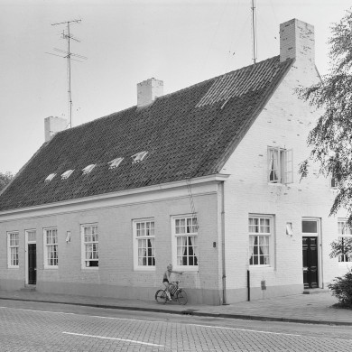 Dorpswoningen onder zadeldak tussen zij-topgevels. Schuiframen met kleine roedenverdeling, 19e eeuw.
