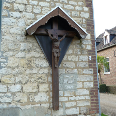 In de tuin van het pand Bosschenhuizen 13 een wegkruis met houten corpus, XIX A.