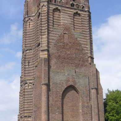 Toren. Overblijfsel van de middeleeuwse kerk. Bouwwerk uit het midden van de 15e eeuw, opgetrokken uit baksteen met lagen van tufsteen. Overhoekse veelvuldig versneden steunberen, uitgebouwde traptoren aan de zuidzijde. Drie geledingen: in de onderste aan de westzijde een hoge, geprofileerde spitsboognis waarin de ingang en een spitsboogvenster, aan de andere zijden telkens een tweetal recht overtoogde en daarboven segmentvormig overtoogde nissen; in de tweede geleding telkens een tweetal door een segmentboog overtoogde en daarboven spitsboogvormige overtoogde nissen; in de bovenste geleding spitsboognissen met galmgaten. Geheel onderaan hebben de spaarvelden in de steunberen en te weerszijden aan de ingang naar links schuin oplopende togen. In al deze nissen tufstenen toten. Mechanisch torenuurwerk van Jos van de Kerkhof, 1937, elektrische opwinding. Gerestaureerd in 1937.
