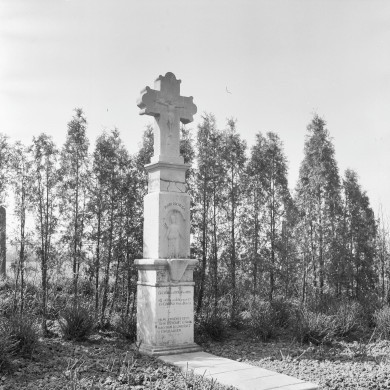 Een hardstenen devotiezuil met reliefvoorstelling van de Moeder van Smarten en bovenop een kruisbeeld; blijkens chronogrammen van 1747.