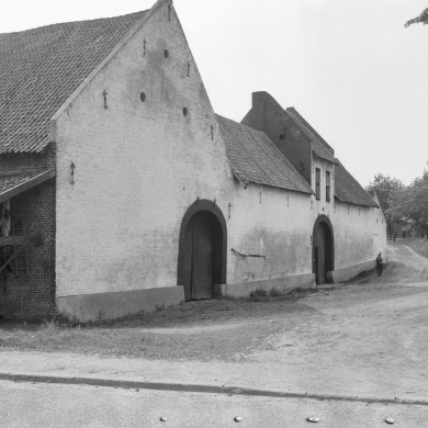 Hoeve van baksteen gelegen aan een binnenplaats met vakwerk en Andreaskruisen, XVII. Gepleisterde gevel met poort. Ankers uit 1802.