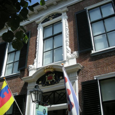 Stadhuis. Drie traveeën breed huis, met volledige verdieping, onder dwarsdak tussen topgevels met topschoorstenen waarop bord; achterbouw onder zadeldak, 1759. Midden ingangspartij rijk versierd. Inwendig stucplafond in gang, trappenhuis en raadzaal.