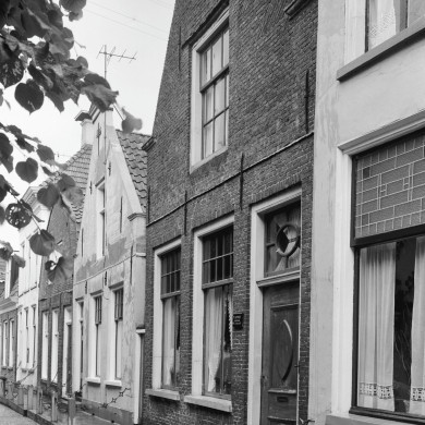 Huisje onder verdieping, 18e eeuw. Gepleisterde voorgevel, waarin deur met gesneden kalf in Lodewijk XIV-trant. Topgevel met natuurstenen beeldhouwwerk in Friese Lodewijk XV-stijl, 1776, afkomstig van het huis Nieuwe Buren 23 te Lemmer. Hardstenen stoeppalen met kettingen.