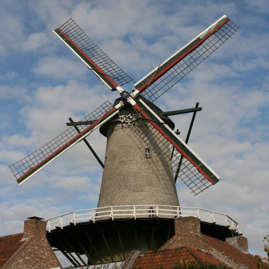 Molen. Zware, ronde, stenen bovenkruier met stelling met schuine stellingschoren, ongetailleerd, uit 1739 herbouwd in 1950.