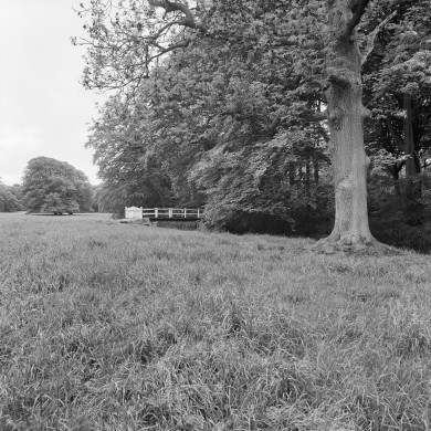 PLATTE BRUG. Brug bestaande uit bakstenen hoofden, ijzeren liggers, een houten dek en twee witgeschilderde houten leuningen, gevat tussen gepunte en afgeschuinde vierkante palen aan de uiteinden en bestaande uit twee door vijf gepunte stijlen verbonden regels boven elkaar, waarvan de onderste evenals de stijlen tussen de knooppunten van afschuiningen is voorzien (tweede helft negentiende eeuw). De brug is vanouds aan de zijde van het Kleine Stuk afgesloten door een houten hek; het tegenwoordige hek vertoont niet de oorspronkelijke vorm.