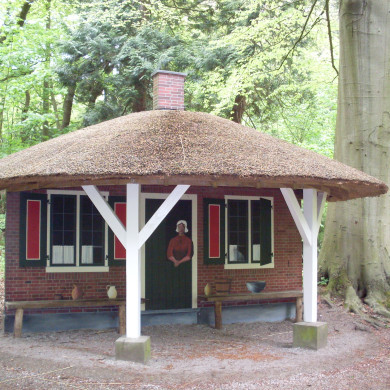 HUISJE VAN KA-BUUR. Het waarschijnlijk enig overgebleven historische voorbeeld in Nederland van een illusionistisch bouwsel in de geest van Van Laar's Magazijn van Tuinsieraaden (1802), bestaande uit een houten schot, beschilderd als ware het een bakstenen gevel van een boerenhuis met een deur in het midden en een tweelichtvenster met luiken te weerszijden, een rond zoldervenster boven de deur en een schoorsteen, en, als driedimensionale componenten, voor dit schot een half-kegelvormig rieten dak, gedragen door twee vierkante houten palen, en tegen de "gevel" twee banken, bestaande uit een plank, gedragen door twee stukken boomstam. Het illusionistische effect wordt versterkt door de geschilderde figuren van een boerin (Ka-buur), die over de onderdeur leunt, een kat voor het rechter raam en een aantal voorwerpen die op de banken lijken te zijn geplaatst. Het geheel dateert in oorsprong waarschijnlijk uit de 1e helft van de 19e eeuw (na de Tweede Wereldoorlog hersteld).