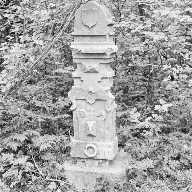 GRENSPAAL, hergebruikte natuurstenen stoeppaal (laatste kwart 16e eeuw/eerste kwart zeventiende eeuw), bestaande uit een van een leeuwenmasker en het opschrift V B voorziene, rechthoekige voet op door een lijst afgesloten sokkel en een voluutvormig, door een kapiteel afgesloten bovendeel, gescheiden door een uitstekende band die met een diamantkop en twee rozetten is bezet.