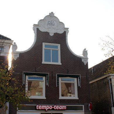 Pand met verdieping onder zadeldak tegen klokgevel met aanzetkrullen en groot gebeeldhouwd kuifstuk. Anno 1781.