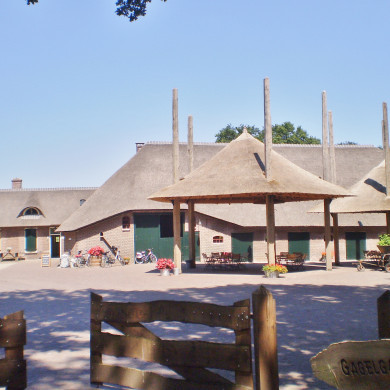 Boerderij, grijsgepleisterd met rieten dak en v.m. karnmolen, dwarshuistype. Keuken met tegeltableaux, goed intact.