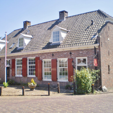 Herberg "de drie ringen". Laag gepleisterd huis met mansarde dak en uithangbord.