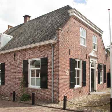V.M. Oude Mannen en Vrouwenhuis, lage gevel met rechte kroonlijst, kleine roedeverdeling, vensters met halve luiken.