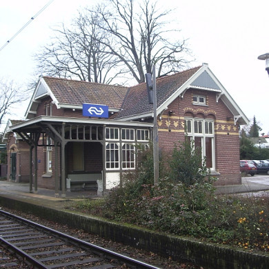 Station N.S. Zeer klein, halte-achtig stationnetjes met chaletdak en, waarschijnlijk ten behoeve van de Koninklijke familie, een luifel over het perron voor de wachtkamer (1898, architect J.F. Klinkhamer).