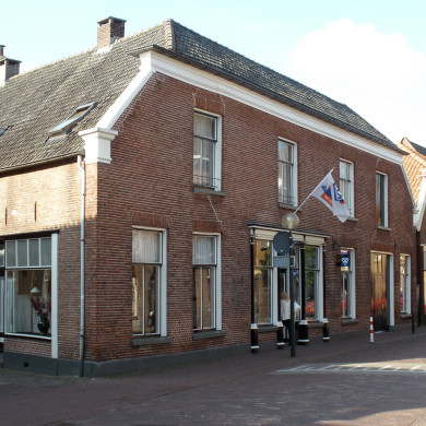 HOEKPAND onder omlopend, afgewolfd schilddak, bestaande uit beganegrond met zolderverdieping, derde kwart 19e eeuw. Brede voorgevel met houten kroonlijst en karakteristieke houten winkelpui uit het derde kwart 19e eeuw. Winkelinterieur uit de bouwtijd.