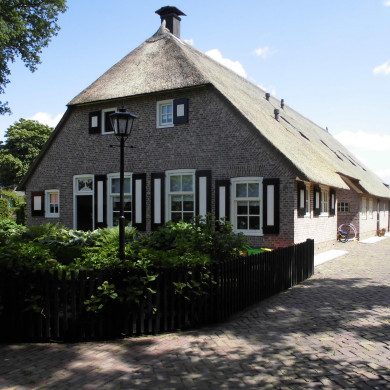 Gave BOERDERIJ van het Staphorstse type. Traditionele, in aanleg vermoedelijk oudere, doch wat betreft detaillering, laat 19e eeuwse Staphorster boerderij onder rieten wolfdak met houten schoorsteen.