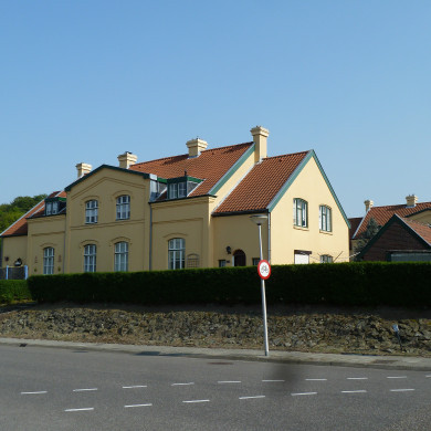 Rechthoekig, gepleisterd blok van vier rug-aan-rug-woningen met verdiep onder met rode muldenpannen gedekt zadeldak; de lange gevels hebben een risalerende middenpartij met lage verdieping onder flauw hellend zadeldak, hebben door iets uitspringende lijsten omgeven muurvlakken en getoogde, aan de