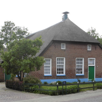 Zeer fraaie BOERDERIJ van het Staphorstse type. Traditionele 19e eeuwse (XIX B) Staphorster boerderij onder rieten wolfdak tegen rechte deels met hout beklede achtergevel; houten schoorsteen.