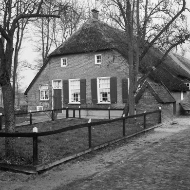Fraaie BOERDERIJ van het Staphorstse type. Traditionele, in aanleg oudere, doch wat betreft detaillering 19e eeuwse (XIX B) Staphorster boerderij onder rieten wolfdak met houten schoorsteen.