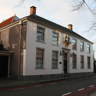 Het Weeshuis. Pand met verdieping, gedekt door een schilddak met hoekschoorstenen; vijf traveeën brede voorgevel; boven de omlijste ingang twee houten beelden van weeskinderen; boven een poort een schildhoudende leeuw en in de zijgevel een gevelsteen 1575.