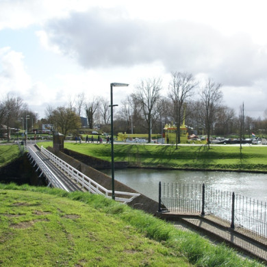 - voor de saillant de Oostbeer ter lengte van pl.m. 43 meter; daarin een recent vernieuwde duikersluis (voorheen inundatiesluis); op de beer een gemetselde monnik;