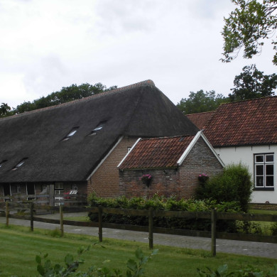 Boerderij bestaande uit een schuur onder rieten wolfdak, waarvoor een woonhuis is aangebouwd met gepleisterde wanden, een ingezwenkt lijstgeveltje en een met pannen gedekt dak, alsmede het bakhuis.