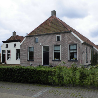 Boerderij bestaande uit een schuur onder rieten wolfdak, waarvoor een woonhuis is aangebouwd met gepleisterde wanden, een ingezwenkt lijstgeveltje en een met pannen gedekt dak, alsmede het bakhuis.