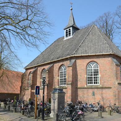 KAPEL, thans Hervormde kerk. Gotisch, bakstenen zaalkerkje (XV) met driezijdige sluiting, steunberen en gedrukte spitsboogvensters. Portaaluitbouw tegen de westgevel. Tegen het, oorspronkelijk waarschijnlijk in steen overwelfde, schip was vroeger aan de noordzijde een zijbeuk aanwezig. De kap en het vierkante klokkentorentje zijn gebouwd na een stadsbrand in 1633. De kapel, die zeer verwaarloosd was en bij de inrichting tot school in 1842 geheel verbouwd, heeft door een ingrijpende restauratie in 1960-'61 haar oorspronkelijke uiterlijk grotendeels herkregen. Kabinetorgel, ca. 1730, vermoedelijk gemaakt door A.A. Hinsz. In de dakruiter een klok van een anonieme gieter, 1658, diam. 45 cm.