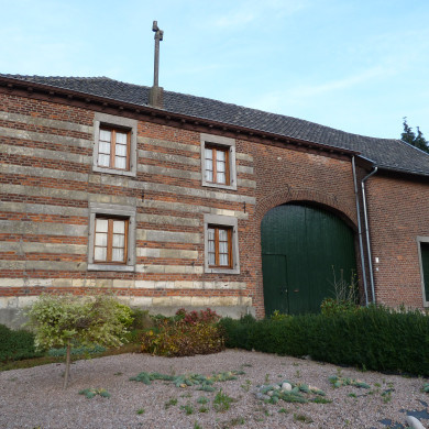 Hoeve met binnenplaats, XIX; van vakwerk, mergel en baksteen; omblokte puntgevel.