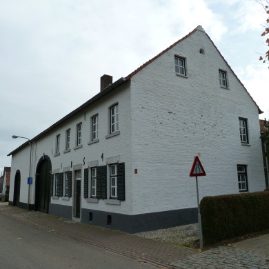 Hoeve van baksteen en mergel om gesloten binnenplaats. In topgevel aan de straat een beeldnisje, XIX B.