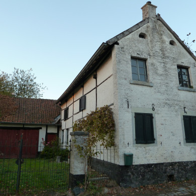 Hoeve van vakwerk en baksteen, aan een open binnenplaats.