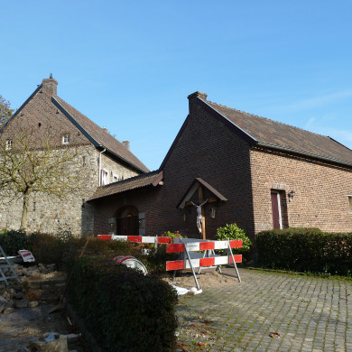 Voormalige kapelanie, schilderachtig gelegen tegen de helling bij een bocht van de weg; van mergel, breuksteen en baksteen, segmentboogvensters in Naamse steen, XVIII B. Nisje met madonnabeeld, 1856.