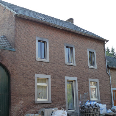 Hoeve met binnenplaats, midden XIX; van baksteen met omlijstingen van ingang en vensters van Naamse steen.