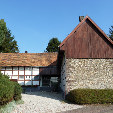 Vakwerk hoeve (XVIII) met binnenplaats op U-vormige plattegrond, onder zadeldaken gedekt met pannen. De topgevel aan de straatzijde heeft een zware bakstenen onderbouw, waarin een gedeeld venster met hardstenen kozijn en middenstijl; in de geveltop en gedeeld houten venster.