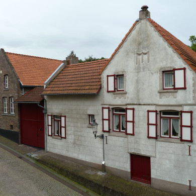 Het Schippershuis, XVI B-XVIIa; zijtopgevels met speklagen. Voorgevel in z.g. Maaslandse Renaissance met kruiskozijnen van Naamse steen.