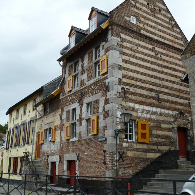 Het Schippershuis, XVI B-XVIIa; zijtopgevels met speklagen. Voorgevel in z.g. Maaslandse Renaissance met kruiskozijnen van Naamse steen.