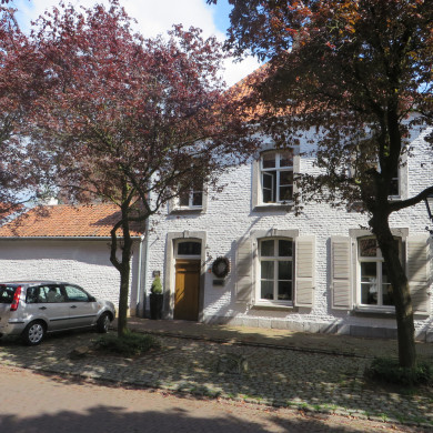 Monumentaal HUIS met verdieping en zadeldak tussen topgevels met vlechtingen. Segmentboogvensters en hardstenen ingangsomraming met 1829. Links aansluitend een muur met een koetspoort, geflankeerd door achtkantige stoeppalen van hardsteen. Lager bakstenen gebouw achter de binnenplaats.