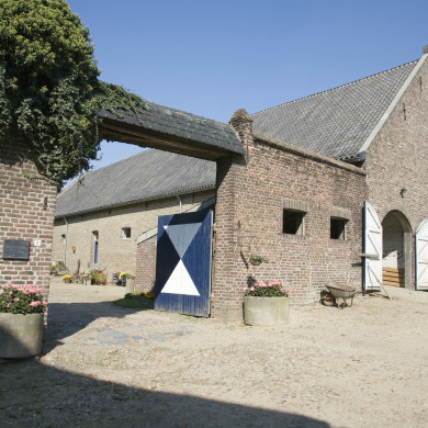Boerenhuisje met rechthoekige ingangsomraming, gedateerd 1857, en dichtgemetselde ellipsboogpoort.