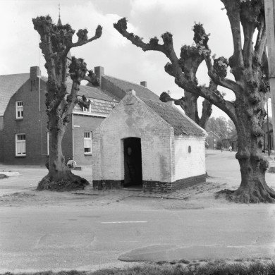 Bakstenen wegkapelletje, 1852, met zadeldak tussen topgevels met vlechtingen. Crucifix in de trant van ca. 1700.
