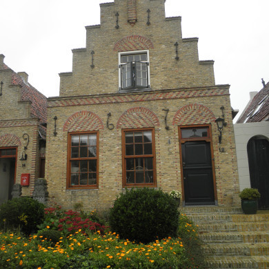 Pand met bakstenen puntgevel. Een stoepsteen.