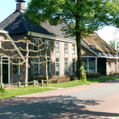 Boerderij uit de eerste helft 19e eeuw onder met riet en pannen gedekt wolfdak.