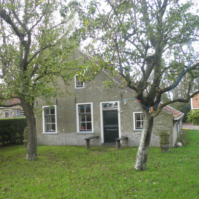 Hoogst eenvoudig huisje in de vorm van een boerderijtje aan de voet van de molen.