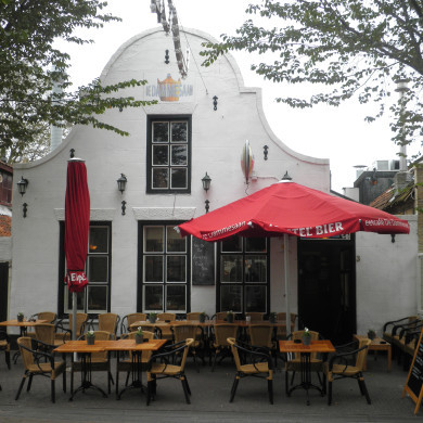 Pandje onder zadeldak tegen topgevel van gele steen met aardige details in rode steen, 1722; later ingezwenkte top gewijzigd.