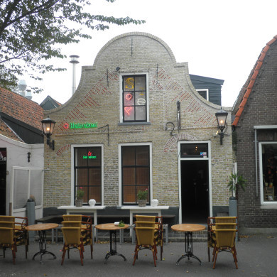 Pandje onder zadeldak tegen topgevel van gele steen met aardige details in rode steen, 1722; later ingezwenkte top gewijzigd.