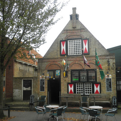 Pandje onder zadeldak tegen topgevel van gele steen met aardige details in rode steen, 1722; later ingezwenkte top gewijzigd.