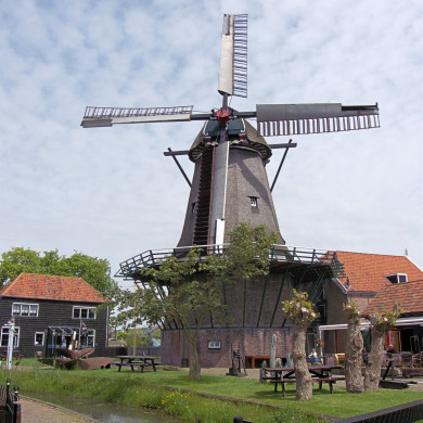 Twee wellicht 19e eeuwse of vroeg 20e eeuwse, inwendig verheelde als graanpakhuizen gebouwde PANDEN, opgetrokken in baksteen, met verdieping onder zadeldaken tussen puntgevels, elk met geschulpte windveren en topmakelaar, met uitzondering van de Z.