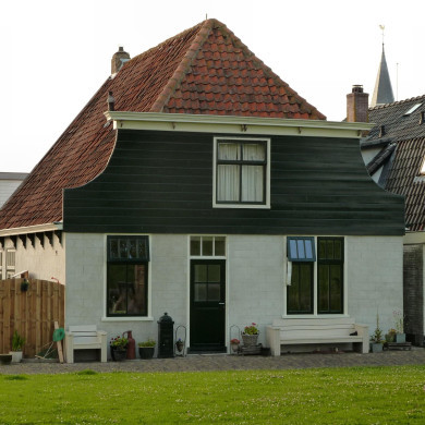 Groot pand met afgeknot ingezwenkt houten voorschot.