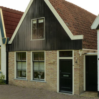 Pandje met houten voorschot met goede details; vensters met roedenverdeling.